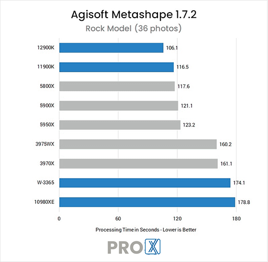 Each step in the Metashape workflow utilizes the CPU differently – some depending only on clock speed, others favoring more cores, but as of Metashape 1.7.2 it seems that extremely high core count processors are not well suited to this application. However, mainstream processors from both Intel and AMD do well.